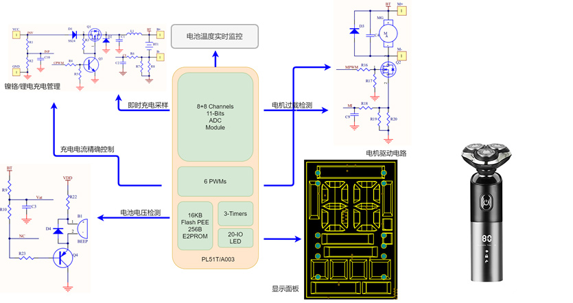 本方案采用PL51T/A003芯片,芯片内集成16KB-flash,256Byte真EEPROM,11Bit-ADC, 6路PWM等丰富资源; 方案软件实现镍铬锂电充电管理,过冲过放等保护;电机驱动和电机卡死等异常防烧机功能;面试动态显示使用时间,剩余电量评估等功能。